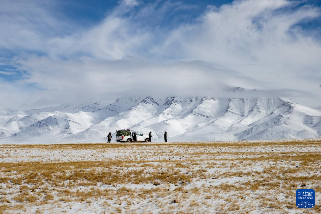 4月9日,羌塘國家級(jí)自然保護(hù)區(qū)那曲地區(qū)管理局野生動(dòng)物專業(yè)管護(hù)員們?cè)谘┥角坝^察地勢(shì)。新華社記者 姜帆 攝