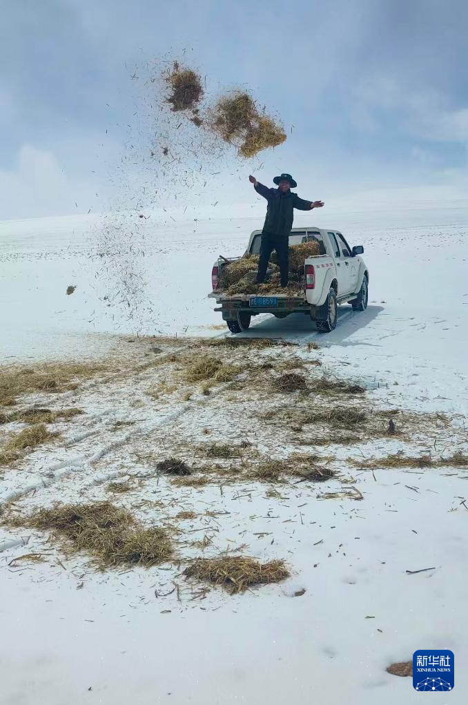 4月13日,羌塘國家級(jí)自然保護(hù)區(qū)那曲地區(qū)管理局野生動(dòng)物專業(yè)管護(hù)員在藏羚羊、野牦牛的出沒區(qū)域拋撒草料(手機(jī)照片)。新華社發(fā)