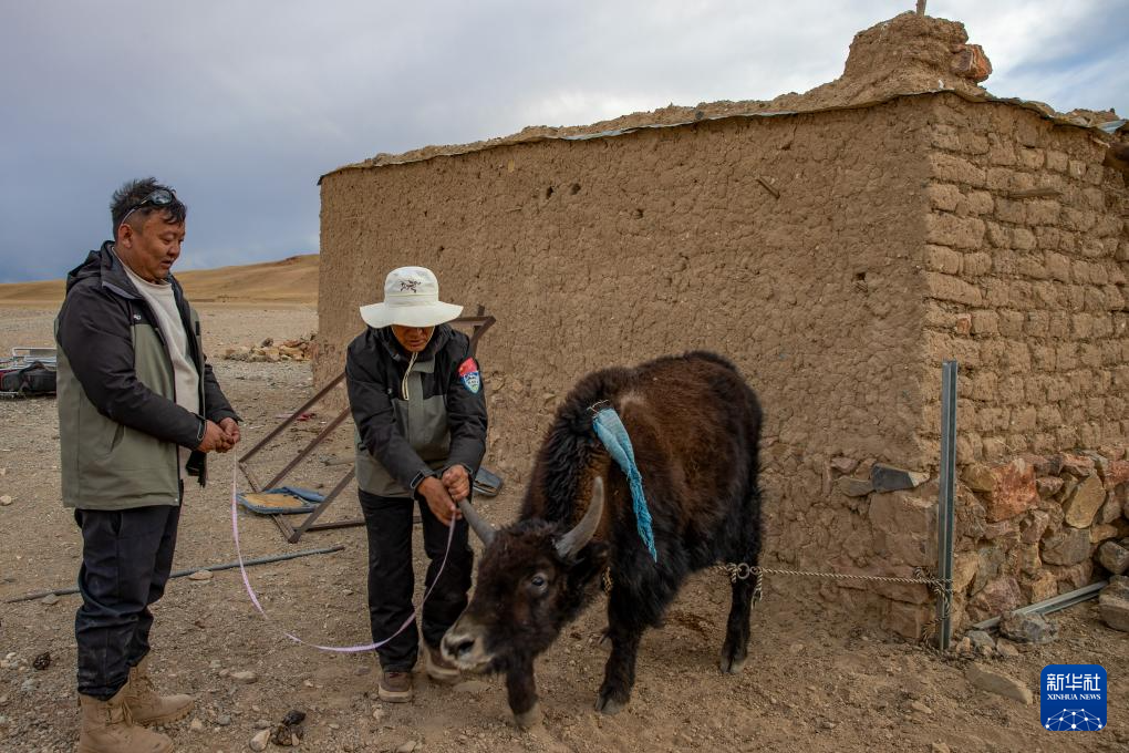 4月8日,羌塘國家級(jí)自然保護(hù)區(qū)那曲地區(qū)管理局野生動(dòng)物專業(yè)管護(hù)員格桑倫珠(左)和羅布在尼瑪縣瑪依野生動(dòng)物管護(hù)站測量收養(yǎng)的小野牦?!版劓亍钡纳眢w數(shù)據(jù)。新華社記者 姜帆 攝