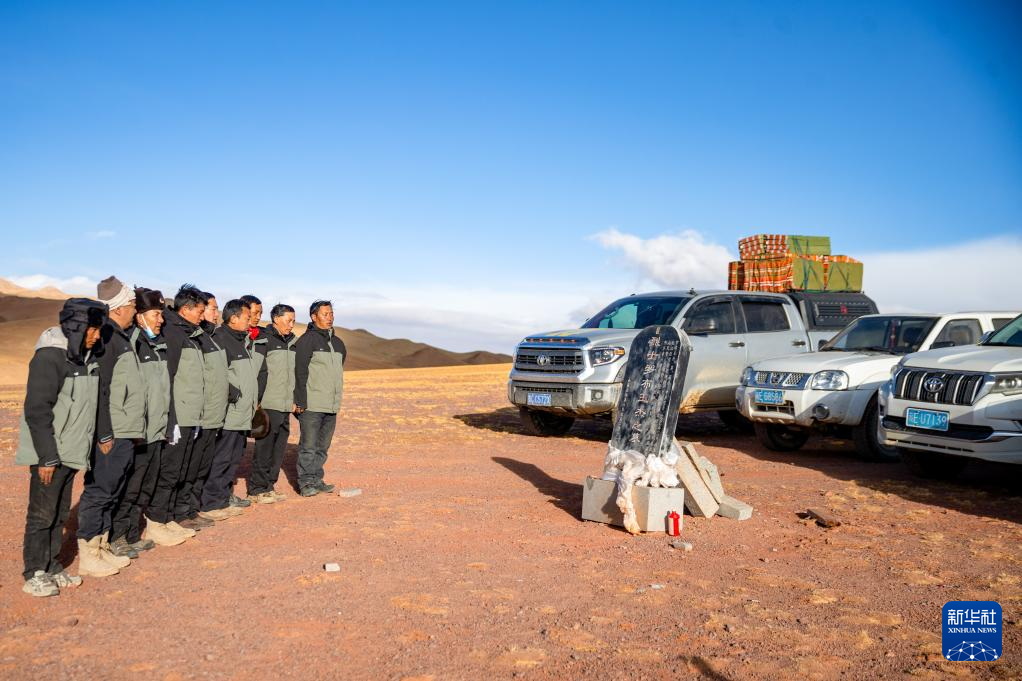 4月8日,即將進(jìn)入“無人區(qū)”進(jìn)行巡護(hù)的羌塘國家級(jí)自然保護(hù)區(qū)那曲地區(qū)管理局野生動(dòng)物專業(yè)管護(hù)員們按慣例在羅布玉杰烈士墓前默哀致敬。羅布玉杰2002年在與盜獵分子的槍戰(zhàn)中犧牲。新華社記者 姜帆 攝