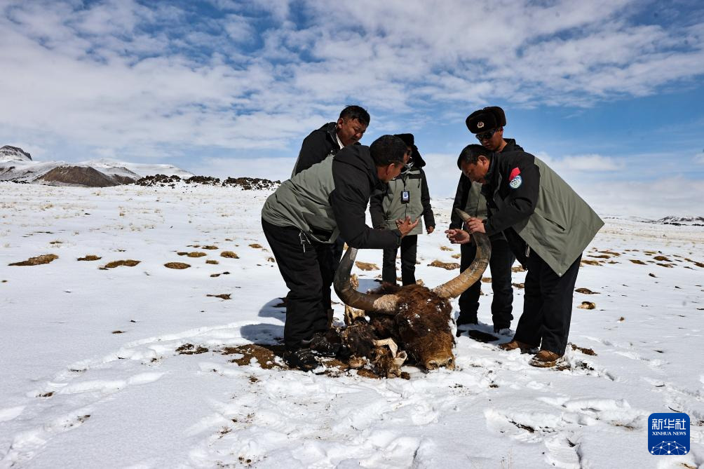 4月10日,羌塘國家級(jí)自然保護(hù)區(qū)那曲地區(qū)管理局野生動(dòng)物專業(yè)管護(hù)員們?cè)凇鞍兔F宗”地區(qū)測量一頭異常龐大的野牦牛遺骸。新華社記者 姜帆 攝