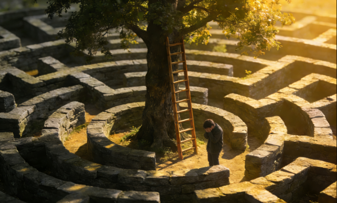 但其實(shí),只要他抬個頭就會發(fā)現(xiàn),面前就有一棵參天大樹,爬上去出路一目了然。