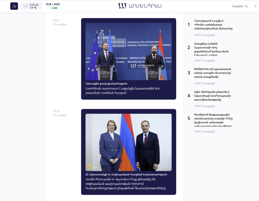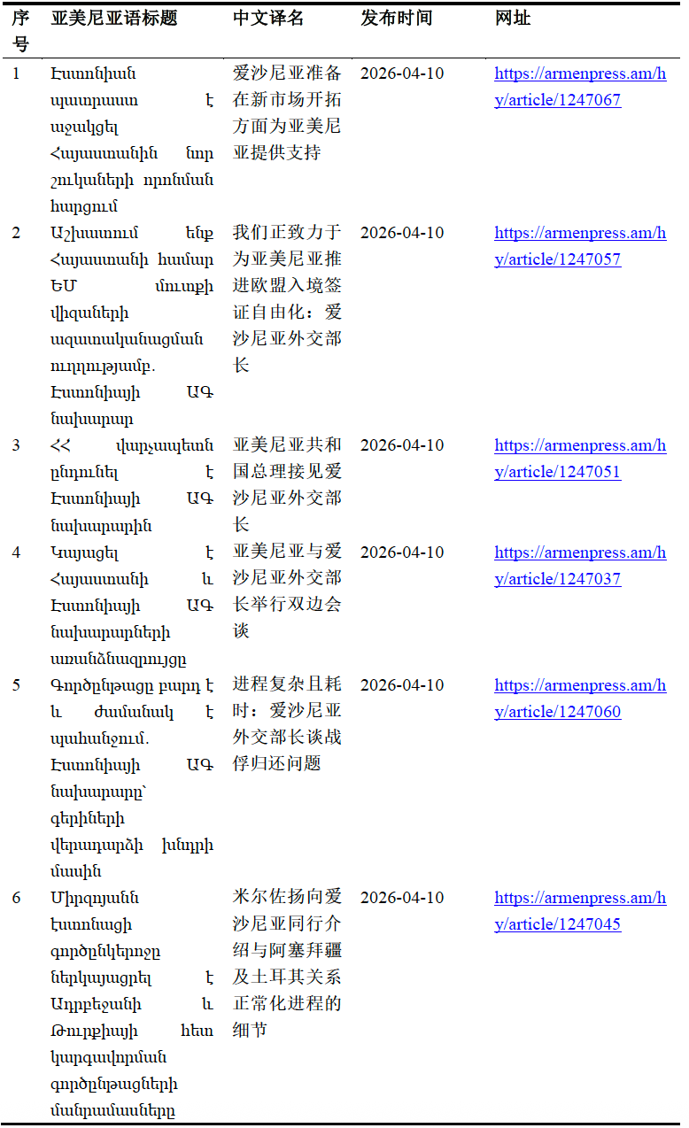 [⑥] ARMENPRESS:《???????? ??????? ? ??????? ?????????? ??? ????????? ??????? ???????》(《愛沙尼亞準備在新市場開拓方面為亞美尼亞提供支持》),Armenpress.am,2026年4月10日,https://armenpress.am/hy/article/1247067,2026年4月11日訪問。