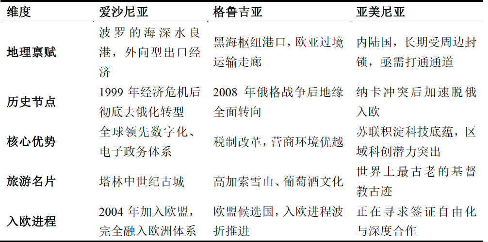 表2 愛沙尼亞、格魯吉亞、亞美尼亞多維度對比表