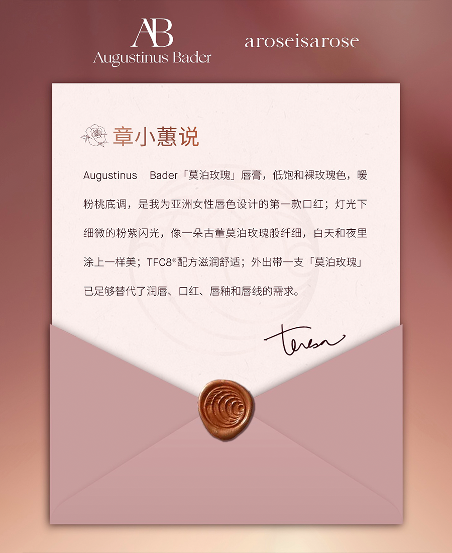 除了上述案例,Augustinus Bader于今年3月攜手章小蕙,推出中國限定版有色唇膏——「莫泊玫瑰 BlushGlow」。這款產(chǎn)品從名稱、色彩靈感,到理念表達,均緊密圍繞章小蕙標(biāo)志性的“玫瑰美學(xué)”展開,而她本人也深度參與了細節(jié)設(shè)計與創(chuàng)作過程。