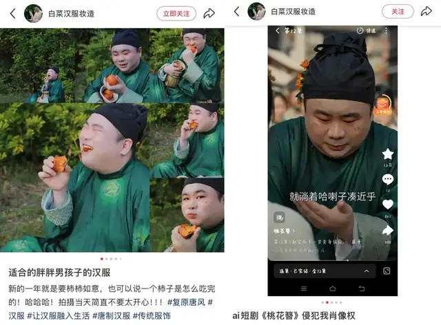 另一側(cè),“AI盜臉”事件已屢有發(fā)生。今年3月,漢服博主“白菜”發(fā)現(xiàn)自己的寫(xiě)真被AI短劇復(fù)刻,成了一個(gè)反派,AI短劇偷普通人臉的話題瞬間沖上熱搜。3月20日,演員楊紫工作室發(fā)文,針對(duì)某作品未經(jīng)授權(quán)利用AI換臉等技術(shù)侵犯肖像權(quán)問(wèn)題,進(jìn)行維權(quán)。