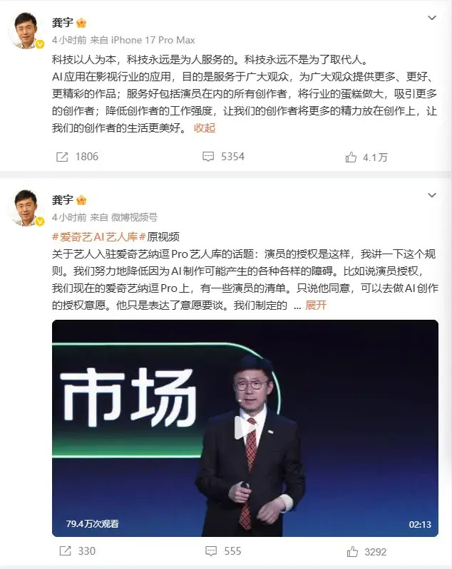 但這并沒(méi)有平息輿論,4月21日上午,已經(jīng)有大半年沒(méi)發(fā)微博的龔宇連發(fā)三條微博進(jìn)行回應(yīng),除了解釋授權(quán)問(wèn)題,他表態(tài)稱,科技永遠(yuǎn)是為人服務(wù)的,科技永遠(yuǎn)不是為了取代人,并強(qiáng)調(diào)AI在影視行業(yè)的應(yīng)用,是為了服務(wù)廣大觀眾和創(chuàng)作者,降低創(chuàng)作者的工作強(qiáng)度,將時(shí)間和精力用在創(chuàng)造出更多更好的作品上。不過(guò),龔宇將評(píng)論設(shè)置成了精選模式,截至發(fā)稿沒(méi)有放出一條留言。