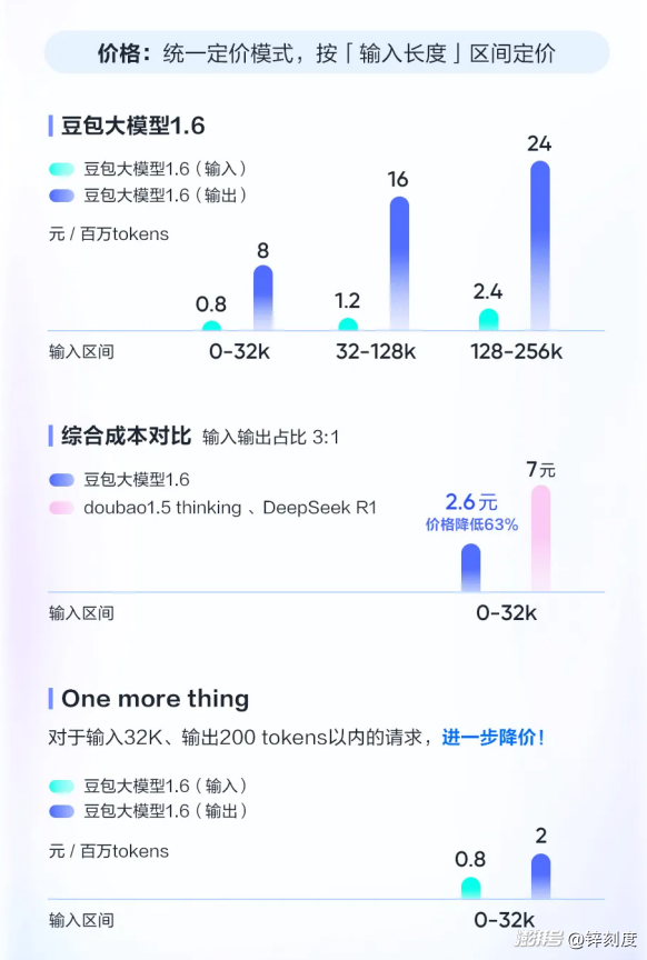 以2025年6月發(fā)布的豆包大模型1.6為例,一改行業(yè)之前的定價(jià)慣例:深度思考或多模態(tài)能力無(wú)需為T(mén)oken額外買(mǎi)單,且Token的價(jià)格隨著0—32K、32K—128K和128K—256K這三個(gè)輸入長(zhǎng)度的增長(zhǎng)而增加,進(jìn)行了分區(qū)定價(jià),性?xún)r(jià)比更高。