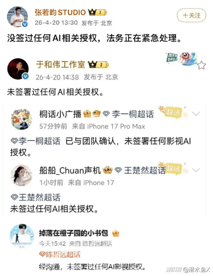 先回到4月20日早上,也就是愛奇藝世界大會第一天。愛奇藝發(fā)布了專業(yè)級影視制作平臺“納逗Pro”,并稱已有超百位深度合作藝人入駐或表達(dá)接洽意愿,授權(quán)其形象、聲音等生物信息用于AI影視制作。然而張若昀工作室在大會結(jié)束后不久,就發(fā)辟謠聲明稱沒有授權(quán),且措辭最強硬——“法務(wù)正在緊急處理”。不久后于和偉跟進(jìn),當(dāng)晚王楚然后援會、李一桐、陳哲遠(yuǎn)團(tuán)隊接力。多家媒體說“跟約好了似的”。