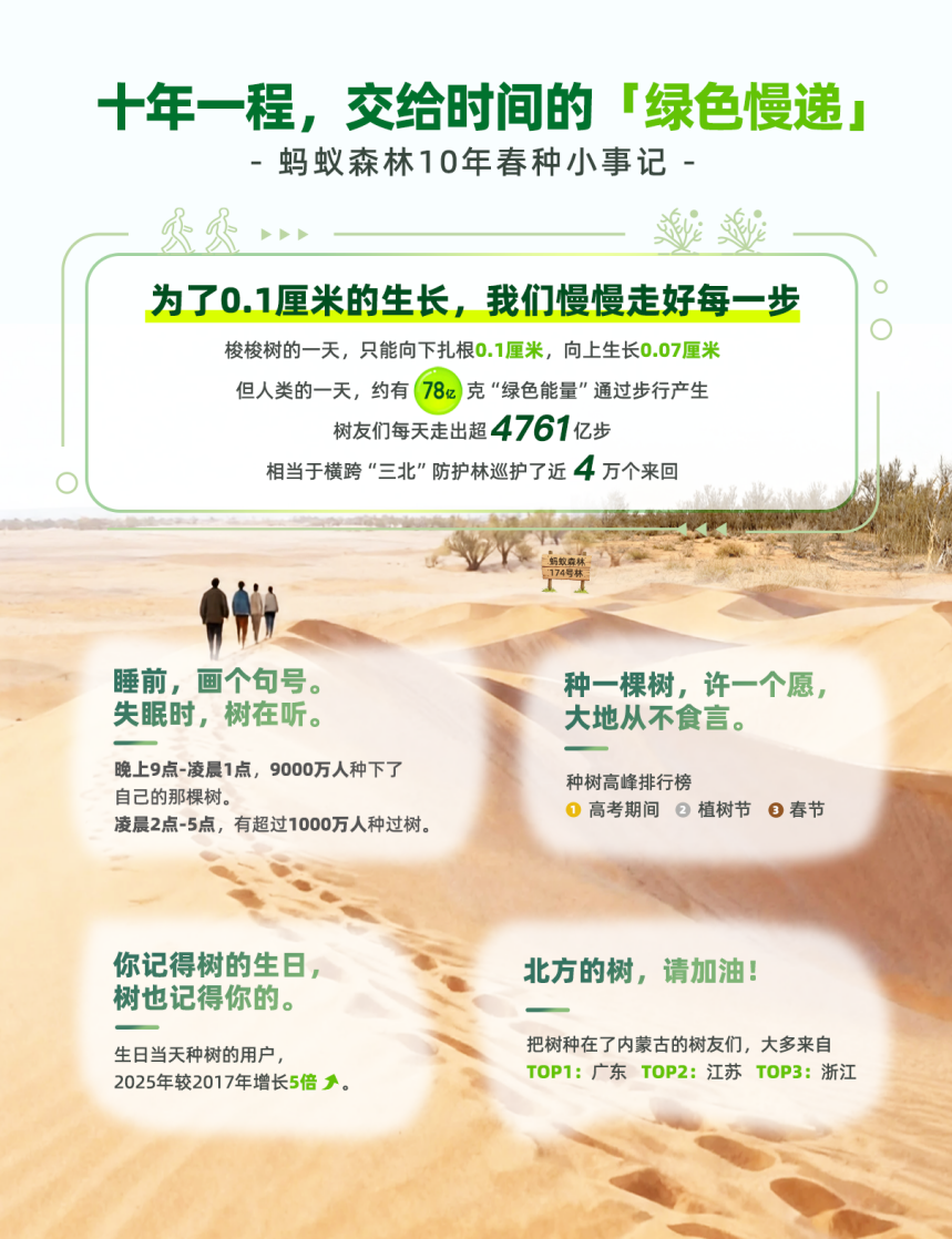 如今,螞蟻森林的累計用戶數(shù)超過7億,成為“全球參與人數(shù)最多的公益項目”之一。對于數(shù)以億計“樹友”來說,10年后的這個春天,手機上種的樹早已投射進現(xiàn)實,阿拉善就是他們“十年夢圓”的地方。