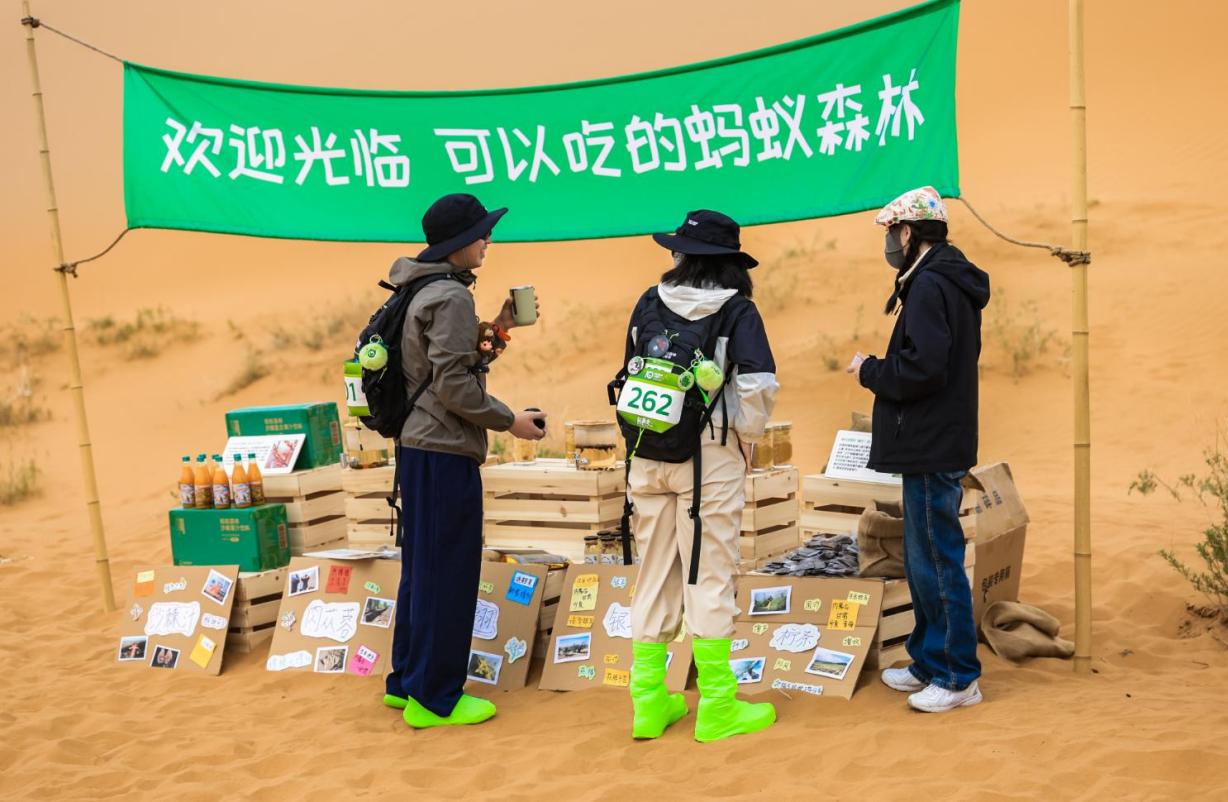 在春種現(xiàn)場,樹友還嘗到了可以“吃”的螞蟻森林?!吧掣C子”也能變成端出豐盛菜肴的"沙漠食堂":梭梭可以接種蓯蓉、連翹的果實可以泡茶、沙棘上的果實制成了果汁……在徒步途中以及終點的“能量補給區(qū)”,所有的果汁、茶飲、甚至肉類、蔬菜都出自種樹后帶來的生態(tài)改善。