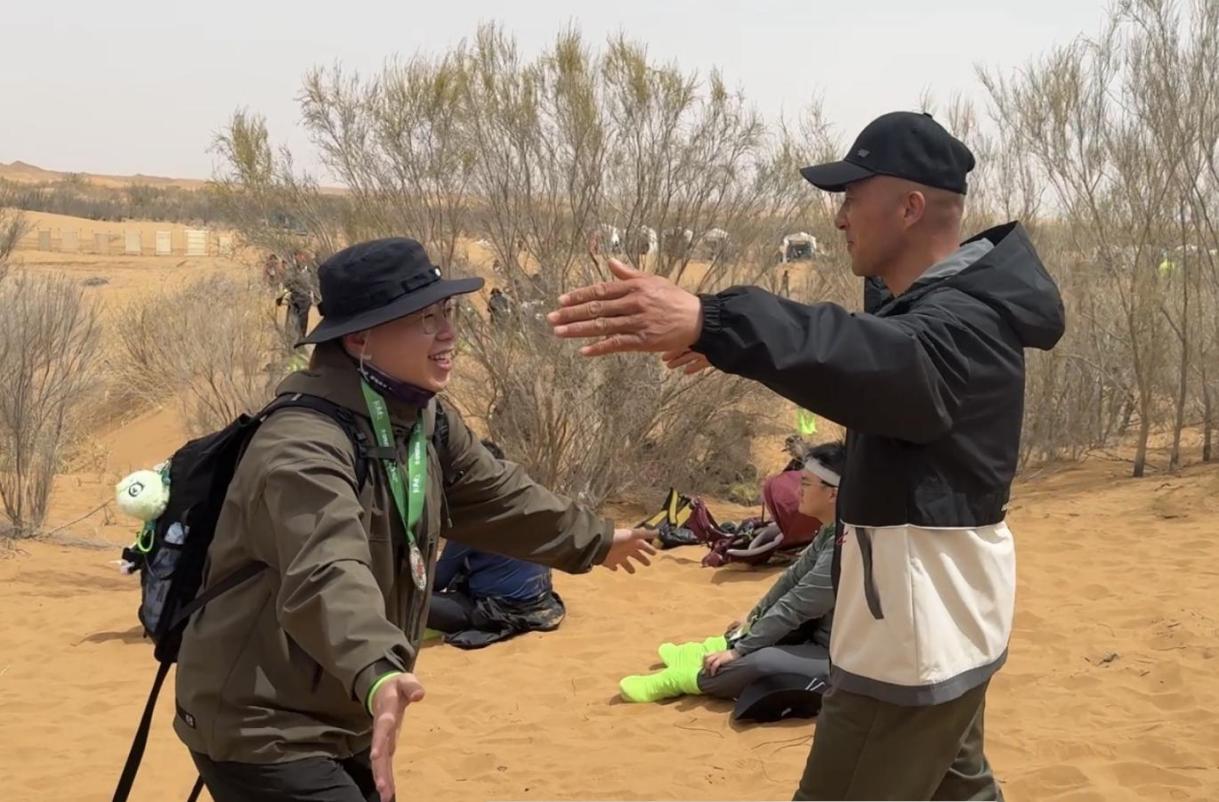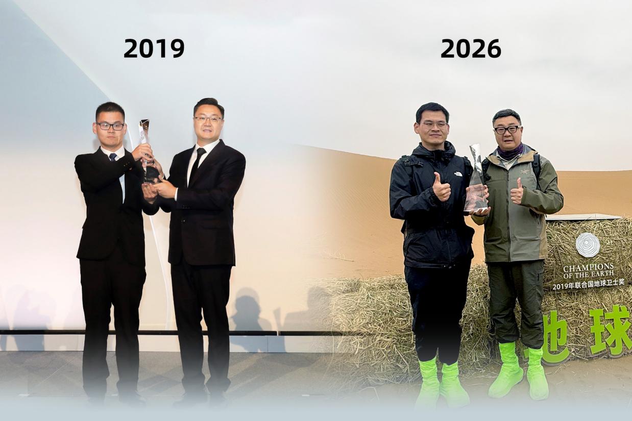 圖注:沈鈞亮與徐笛在阿拉善重逢,再現(xiàn)“地球衛(wèi)士獎”捧杯瞬間