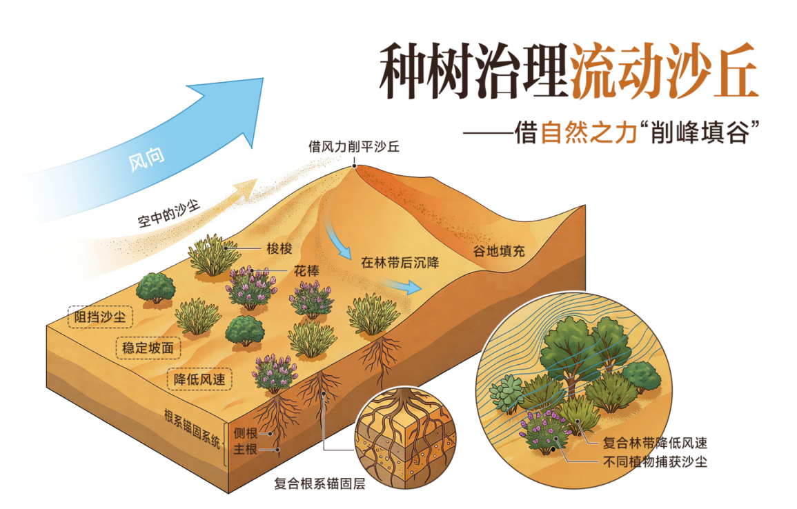 種樹人會按沙丘的自然形態(tài),把樹種在迎風(fēng)坡的中下部,不能種得太密,也不必太整齊。只要樹苗生根,就能擋風(fēng)阻沙。而一旦小樹未能成活、甚至“全軍覆沒”,來年就繼續(xù)補植補種。