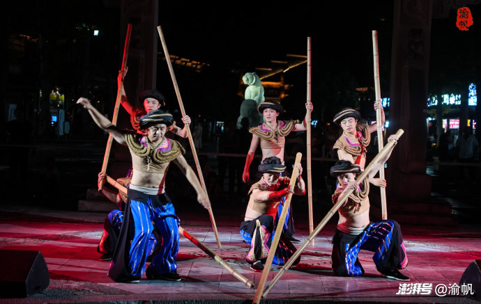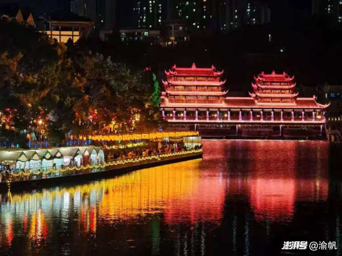 黔江的夜,是流動(dòng)的光影畫卷。今年五一,三岔河核心水域?qū)⑹状伍_(kāi)啟商業(yè)化夜游——“三岔河·武陵水華”。當(dāng)夜幕降臨,兩岸燈火璀璨,你可以乘坐古色古香的竹筏或主題花船,在波光粼粼中開(kāi)啟一場(chǎng)30分鐘的閉環(huán)夜游。水面上,超燃的“水上飛人”騰空而起,激起層層浪花;非遺“火壺”表演在夜色中劃出金色的光圈,水與火的交融將帶來(lái)極具沖擊力的視覺(jué)震撼。