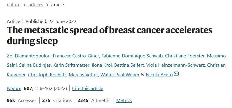 [2] Diamantopoulou, Z., Castro-Giner, F., Schwab, F.D. et al. The metastatic spread of breast cancer accelerates during sleep. Nature 607, 156–162 (2022). doi:10.1038/s41586-022-04875-y