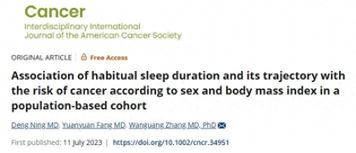 [1] Deng Ning,et al.,(2023).Association of habitual sleep duration and its trajectory with the risk of cancer according to sex and body mass index in a population‐based cohort.Cancer,DOI:10.1002/cncr.34951.