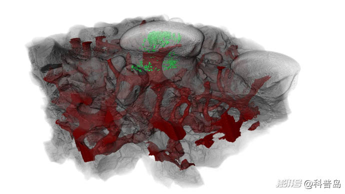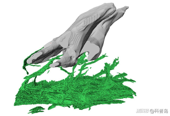 對吸口鯰魚的齒狀結(jié)構(gòu)的掃描顯示神經(jīng)(綠色部分)可將感覺信息從齒狀體傳遞到神經(jīng)系統(tǒng)。(圖片來源:芝加哥大學(xué))
