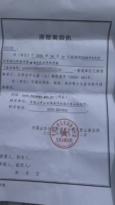 平頂山市公安局湛河分局九里山派出所出具的《接報案回執(zhí)》顯示,該所在2026年4月22日,已就張女士報案稱馬某擾亂公共秩序一案接報登記。4月23日,紅星新聞記者致電該派出所詢問此事,一工作人員稱該案已立案,正在辦理中。